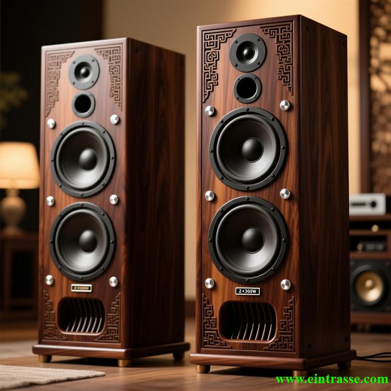 Walnut wood grain and craftsmanship, handcrafted, moisture-proof, anti-aging, and fade-resistant; the cabinet is sturdy, thick, and resonance-free. A three-way design (high, mid, and low frequencies) with precise port design widens the low-frequency range; a 4-inch tweeter delivers delicate and transparent sound; a 6-inch midrange driver reproduces vocals accurately; and a 9-inch woofer provides powerful and impactful sound.